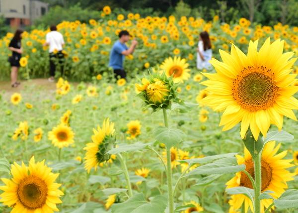수원 광교호수공원 제2주차장 옆에 꽃이 만개했다. 축구장 1.4배 넓이 부지가 황화코스모스, 코스모스, 해바라기로 뒤덮였다. 수원시가 조성한 ‘꽃빛단지’다.