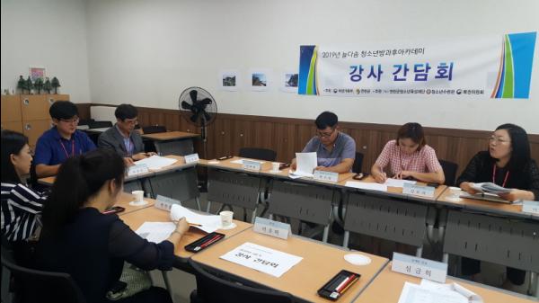 연천군청소년수련관 청소년방과후아카데미는 지도 강사 간의 원활한 교류와 정보공유의 장을 마련하여 늘다솜 청소년방과후아카데미의 운영과 수업의 질을 높이기 위해 청소년수련관장 참석하에 지난 6일 지도 강사 4명과 방과후 아카데미 운영진 3명이 모여 ‘2019년 늘다솜 청소년방과후아카데미 3분기 강사간담회’를 개최 했다.