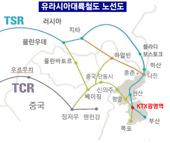 광명시는 KTX광명역에서 출발한 유라시아 대륙철도가 북한의 평양을 거쳐 신의주와 중국 단동, 베이징을 지나 유럽으로 가는 노선, 평양을 거쳐 원산 나진 과 러시아 하산, 블라디보스톡, 시베리아를 거쳐 유럽으로 가는 노선을 연결하기 위해 1단계로 중국의 단동, 훈춘 그리고 러시아 하산과 교류를 추진중이다.