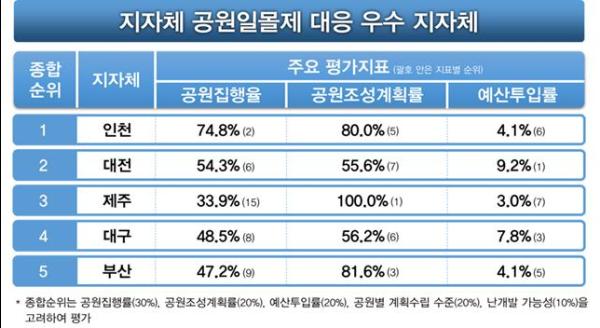 대전시 또한 공원집행률, 공원조성 계획율, 예산투입률에서 상위권을 차지하여 우수한 평가를 받았으며, 제주도는 공원집행률이 낮았음에도 실효 대상 공원 전체를 조성할 계획을 수립하고, 적극적인 예산투입을 통해 효과적으로 공원일몰제에 대응하고 있는 것으로 평가됐다.