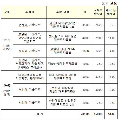 교육부와 한국벤처투자㈜는 2019년 대학창업펀드 투자조합으로 7개 조합을 선정하여 발표했다.