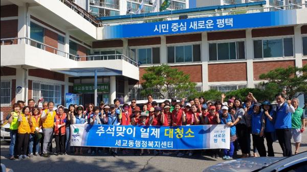 평택시 세교동행정복지센터는 10일 다가오는 추석을 맞이하여 세교동 8개 단체와 환경미화원 등 50여명이 참석해 세교동행정복지센터 아파트 단지 주변에서 ‘추석맞이 일제대청소’를 실시했다.
