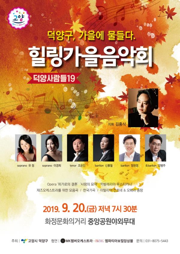 고양시 덕양구가 주최하는 힐링가을음악회 ‘덕양사람들19’가 오는 20일 오후 7시 30분 화정중앙공원 야외무대에서 열린다.