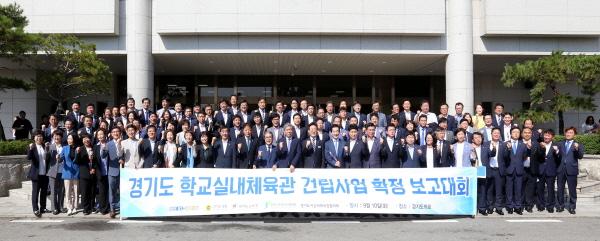 ‘경기도 학교실내체육관 건립사업 확정 보고대회’가 경기도의회 앞에서 경기도, 경기도의회, 경기도교육청, 경기도시장군수협의회, 경기도시군의장단협의회 등 5개 기관이 참여한 가운데 개최됐다.