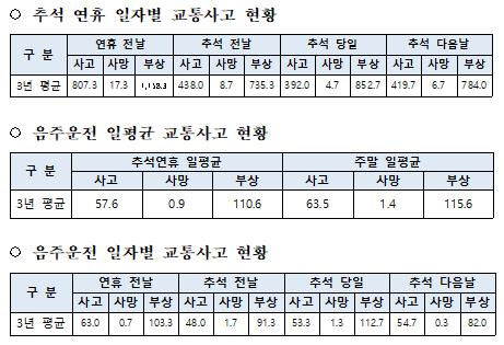 추석 연휴 기간 중 교통사고 주요 항목인 음주운전·졸음운전·고속도로상 교통사고를 분석한 결과는 다음과 같다.