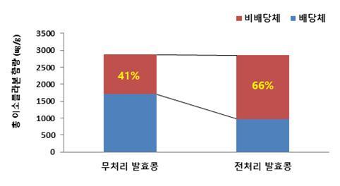 현재 유통 중인 발효콩 15개 제품과 전처리 발효콩을 비교했다. 유통 중인 발효콩의 비배당체 이소플라본 함량은 약 25%인데 비해 전처리 발효콩은 66%로 2.6배 가량 높았다.