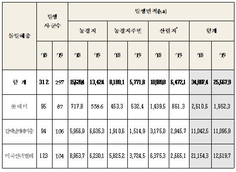 올해 주요 돌발해충 발생면적은 지난해보다 26.3%) 줄어든 25,668ha로 확인됐다. 지난해 비슷한 기간 동안 발생한 면적은 34,808ha로 나타났다.