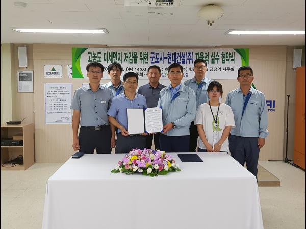 군포시가 미세먼지 감축을 위해 지역 내에서 대형 건설 사업을 시행 중인 현대건설와 ‘자율 살수’ 업무협약을 체결했다.
