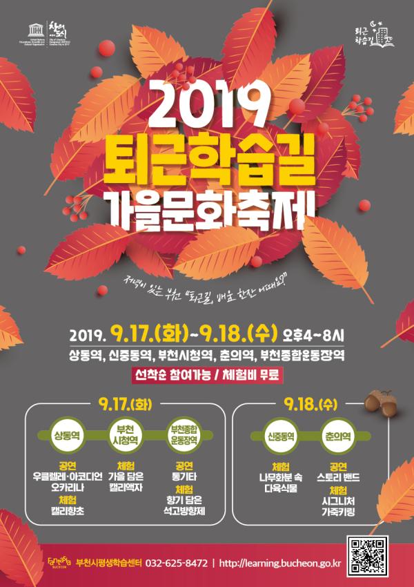 부천시평생학습센터는 추석연휴가 끝난 오는 17일과 18일 오후 4시부터 8시까지 지하철 7호선 5개 역사 안에서 ‘2019 퇴근학습길 가을문화축제’를 연다.