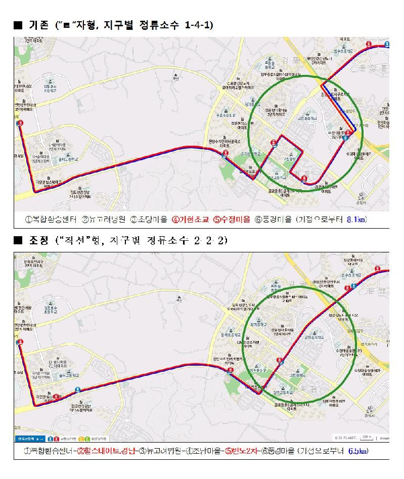 시는 문제 해결을 위해 지난달 18일부터 3일간 운양동, 장기동, 구래동을 순회하는 주민 설명회를 개최하고 노선 개선의 필요성을 알리면서 지역별로 최적 대안을 위해 의견수렴 했으며, 각 동별로 올라온 개선안과 여론 등을 종합검토해서 이번에 노선을 직선화하고 그동안 한강신도시 A, B, C지구별로 1-4-1 형태이던 정류소수를 2-2-2 형태로 개선해 운행할 예정이다.