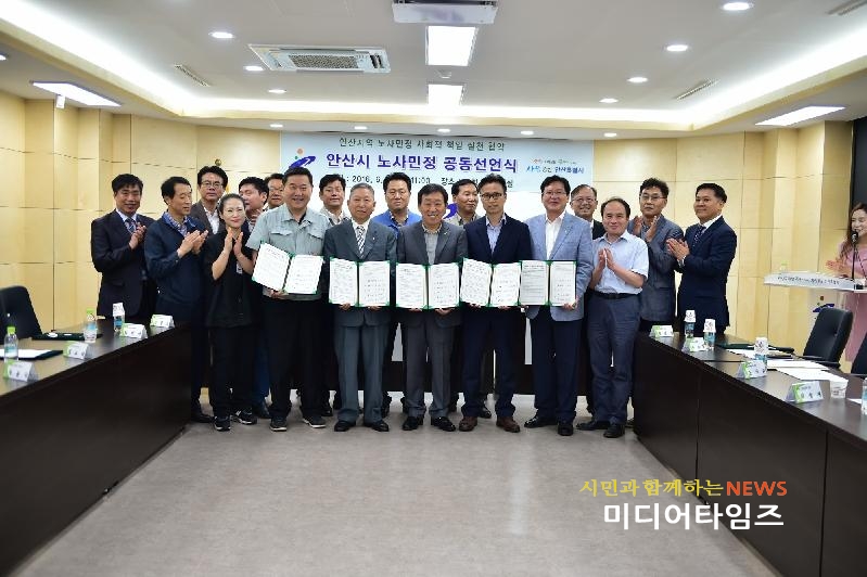 [미디어타임즈= 이영희 기자] 안산시 노사민정협의회(위원장 제종길 안산시장)는 6월 14일 시청 제1회의실에서 노동자와 사용자, 주민, 정부대표 등이 참여한 가운데 ‘노사민정 사회적 책임 실천 공동선언문’을 채택했다.
