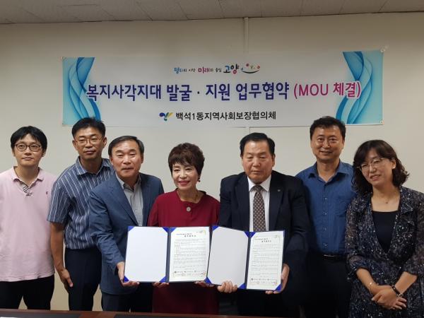 고양시 일산동구 백석1동 행정복지센터와 지역사회보장협의체는 지난 10일 관내 백석초등학교와 복지사각지대 발굴 및 지원체계 강화를 위한 업무 협약을 체결했다.