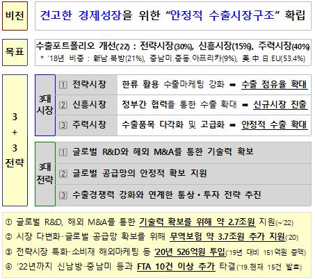 정부는 대외리스크에 흔들리지 않는 안정적 수출시장 구조를 확립하기 위해 무역보험 3.7조원을 추가로 지원하여 수출시장 다변화를 추진하고 글로벌 공급망을 안정적으로 확보하는 한편, 글로벌 R&D와 해외 M&A를 통한 기술력 확보로 수출경쟁력을 강화하기 위해 2.7조원을 지원하고, 2020년 전략시장 특화, 소비재 해외 마케팅 등에 올해보다 151억원 늘어난 526억원을 투입하기로 했다.