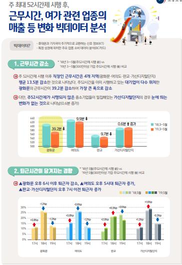 고용노동부는 케이티와 비씨카드에 의뢰하여 직장인이 많은 광화문, 여의도, 판교, 가산디지털단지 등 4개 지역에서 주 52시간제 시행 이후 직장인의 근무 시간, 출퇴근 시간 및 여가 활동 업종의 매출액 변화를 분석했다.
