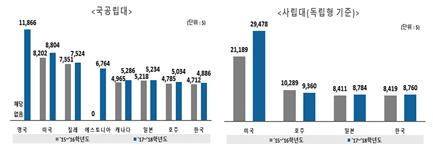자료 제출 국가 중 우리나라의 등록금은 국·공립대학은 8번째로 높았으며, 사립대학은 4번째로 높게 나타났다.