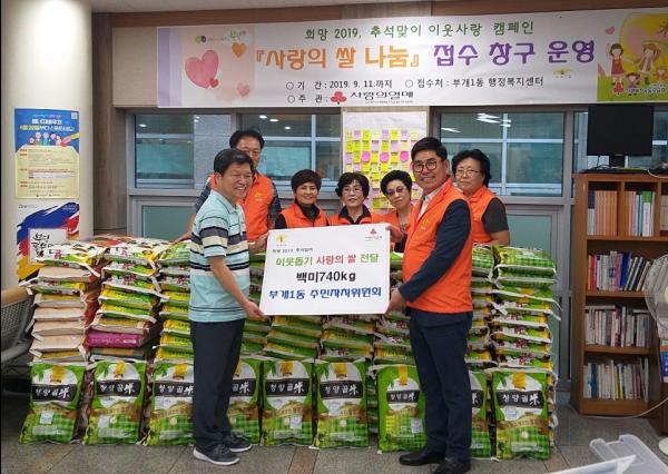 부개1동 통장자율회는 지난 9일 구에서 실시하는 추석맞이 ‘사랑의 쌀 나눔’을 위한 쌀 3,000kg을 동 행정복지센터에 전달했고, 10일에는 주민자치위원회가 쌀 740kg을 기탁했다.