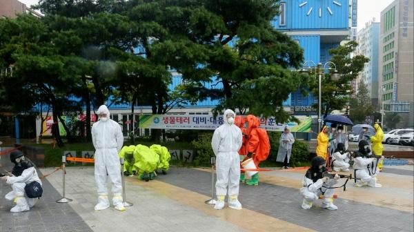 훈련은 의심물질 발견 및 신고, 초동대응팀 구성 및 관계기관 상황전파, 신속키트를 이용한 의심물질 검사, 정밀검사를 위한 환경검체 채취 및 이송 등 순으로 진행됐다.