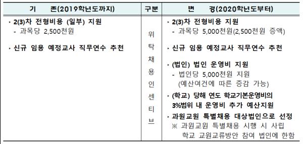 도교육청은 2020학년도부터 위탁채용을 실시하는 법인에 대해 법인 운영비 500만원, 신규교원 채용 2차 전형 비용 500만원, 당해 연도 학교기본운영비 3% 범위 내 학교 운영비 추가 예산, 신규 임용 예정교사 직무연수, 교육공무원 특별채용 대상 법인으로 선정 등을 지원할 방침이다.
