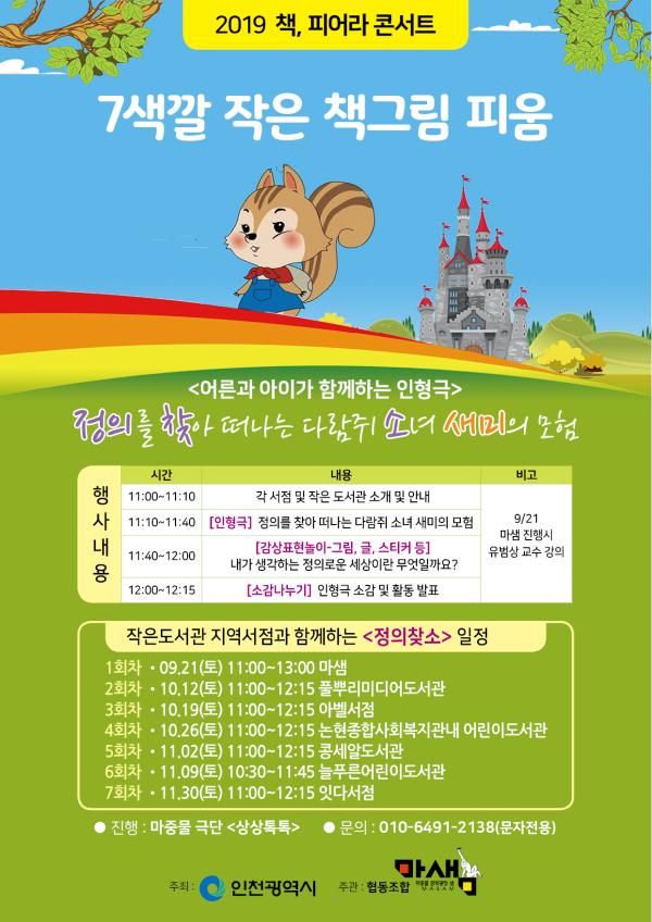 인천광역시는 오는 27일부터 11월 30일까지 ‘2019 제3차 책, 피어라 콘서트 ‘7색깔 작은 책그림 피움’’을 개최한다.