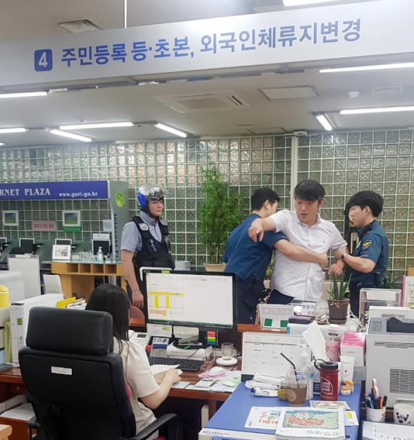 구리시는 추석 연휴 전인 지난 11일 종합민원실에서 민원인 응대 과정에서 발생할 수 있는 비상 상황을 대비하여 보안 업체 및 경찰과 합동으로 ‘특이 민원 발생 대비 모의 훈련’을 실시했다.