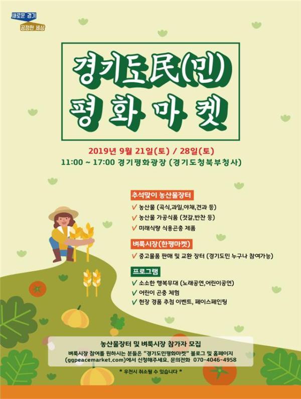 경기도가 오곡백과가 익는 풍성한 가을을 맞아 9월 경기도청 북부청사 경기평화광장에서 ‘경기도민 평화마켓 ? 농산물 장터’ 등 가족과 함께 즐길 수 있는 다채로운 프로그램을 마련했다.