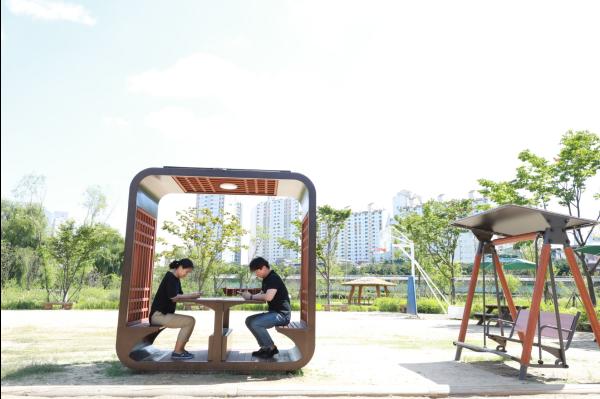 ‘태양광 스마트 퍼걸러’는 지붕에 태양광 패널을 부착, 이를 통해 에너지를 생산하는 신 재생에너지 미니 발전소다. 지붕에 설치된 태양광 발전 패널이 햇빛을 가리는 그늘막과 전기생산설비의 역할을 동시에 하게 된다. 생산된 전기는 휴대폰 유·무선 충전, 경관조명 등에 활용된다.