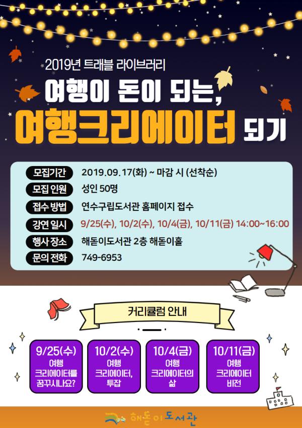 “여행”을 특화주제로 운영되고 있는 해돋이 도서관에서는 ‘여행이 돈이 되는, 여행크리에이터 되기’라는 주제로‘트래블 라이브러리’ 강연을 개최한다.