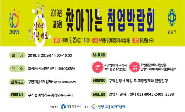 안양시가 주관하는 ‘찾아가는 취업박람회’가 오는 20일 오후2시부터 4시까지 호계3동행정복지센터 대회의실에서 개최된다.