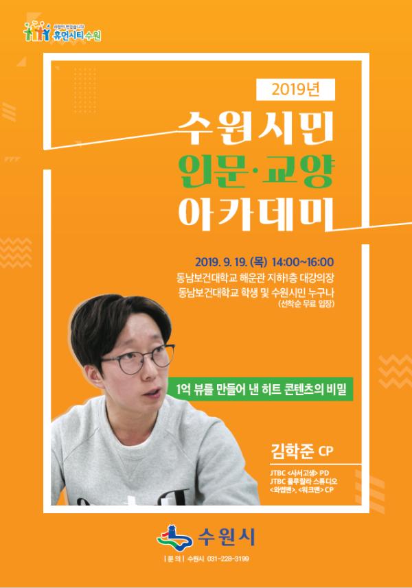 수원시가 오는 19일 오후 2시 동남보건대학교 해운관 대강당에서 ‘2019 수원시민 인문교양 아카데미’을 연다.