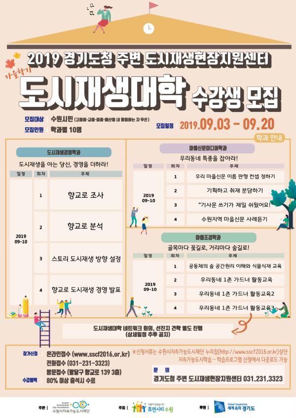 수원시지속가능도시재단은 오는 20일까지 ‘2019 경기도청 주변 도시재생대학 2학기 과정’ 수강생을 모집한다.