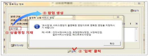 출원인이 서식작성기에 ‘불명확한 상품명칭’을 입력하는 경우, 명확한 상품명칭에 대한 예시 메시지가 팝업으로 생성되고 해당 불명확 상품명칭은 입력이 되지 않는다.