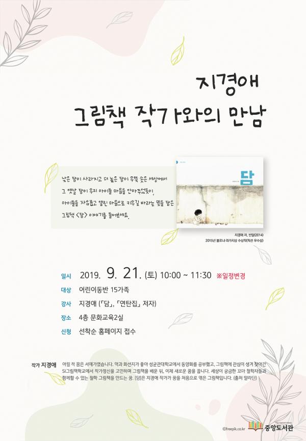 이번 작가와의 만남은 지난 6월에서 8월까지 중앙도서관 1층 커뮤니티실에 전시됐던 ‘작가의 방’에서 이용자들에게 가장 많은 호응을 얻었던 지경애 작가를 초대해 ‘담’과 ‘나’의 이야기라는 주제로 작가와 독자가 소통할 수 있는 시간을 가질 예정이다.