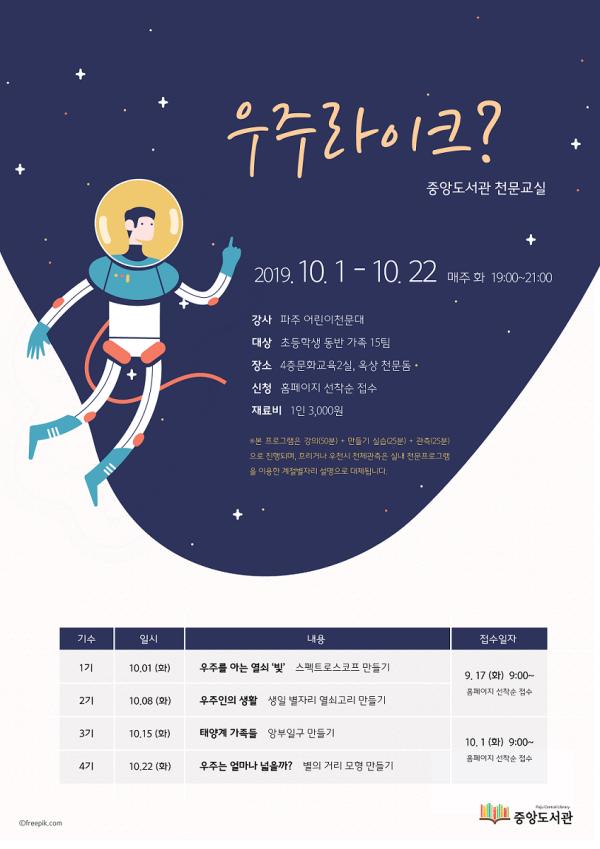 오는 10월 1일부터 22일까지 매주 화요일 오후 7시부터 총 4주간 운영되는 천문교실은 기수별로 가족단위 15팀이 참가 가능하다. 행사는 천문 강의 후 각 기수별로 스펙트로스코프, 별자리 열쇠고리, 앙부일구, 별의 거리 모형 만들기 실습을 한 뒤 중앙도서관 옥상 천문 돔에서 별자리를 직접 관측하는 순서로 진행된다. 천체관측은 흐리거나 우천 시 실내 프로그램으로 대체된다.