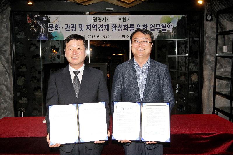 [미디어타임즈= 신정식 기자] 광명시(시장 양기대)는 15일 광명동굴 와인레스토랑에서 경기도 포천시와 문화·관광 활성화를 위한 업무협약을 체결하고, 상호 지역경제 발전을 도모해 나가기로 했다고 밝혔다.