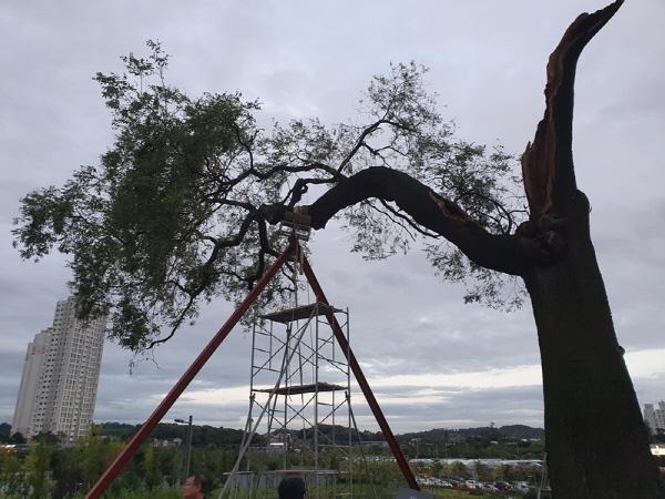 인천 남동구는 지난 7일 제13호 태풍 ‘링링’에 의해 훼손된 구월동 아시아드근린공원 내 보호수에 대한 피해복구에 나섰다.
