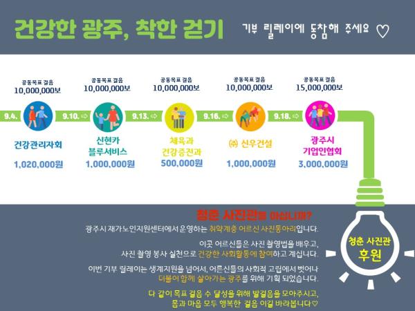 이번 착한걷기 기부릴레이는 누적 목표 걸음 수 5천500만보 달성 시 광주시 재가노인지원서비스 센터에서 운영 중인 ‘청춘 사진관’에 기부금이 전달된다. 청춘사진관 후원은 기존의 취약계층 생활비 지원 등의 복지개념에서 벗어나 어르신들의 사회활동 강화를 위한 지원으로 치매예방, 사회고립 예방 등을 추구하는 새로운 개념의 사회공헌 활동이다.