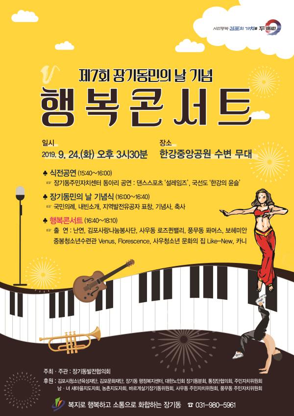 장기동행정복지센터는 오늘 24일 한강중앙공원 수변 무대에서 개청 7주년을 기념해 ‘제7회 장기동민의 날 기념식 및 행복콘서트’를 개최한다.