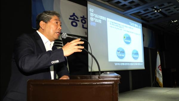 송한준 경기도의회 의장이 17일 경기지역 중견 언론인들에게 제10대 경기도의회의 중심 철학인 ‘공존’의 가치를 설명하며 지방의회와 언론 간 공존으로 ‘상생방안’을 마련해야 한다고 강조했다.