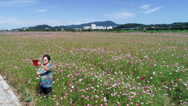 청미천을 따라 펼쳐진 1만여 평의 강변에 코스모스가 활짝 피기 시작해 한 폭의 그림 같은 풍경을 연출하고 있다.