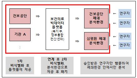 또한 개인정보 유출 우려를 최소화하기 위하여, 데이터에 개인정보를 알아볼 수 없도록 기술적 조치를 실시하고, 연구자는 이를 인터넷에 연결되지 않은 폐쇄된 연구공간을 통해서만 열람·분석하게 된다.