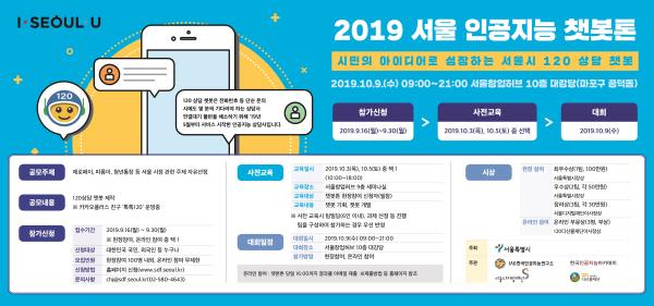 챗봇톤은 2019년 10월 9일에 서울창업허브에서 개최되며, 참가 신청은 서울시 홈페이지를 통해서 가능하다. 접수마감은 30일까지이다.