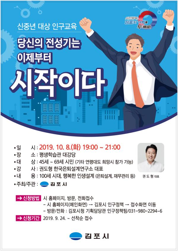 김포시는 오는 10월 8일 저녁 7시부터 9시까지 평생학습관 대강당에서 신중년 대상 인구교육을 실시한다고 밝혔다.