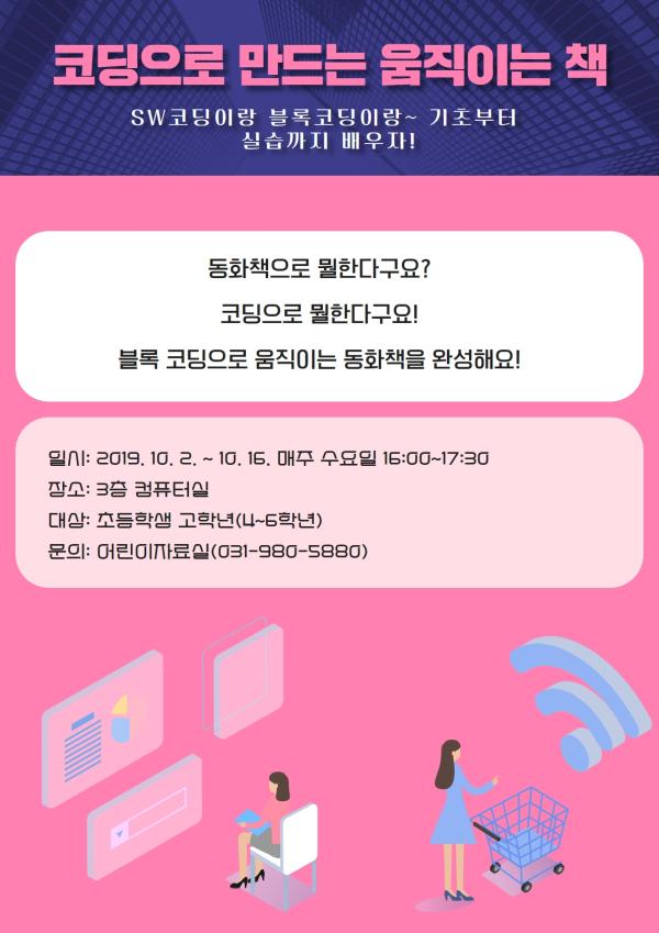 ‘코딩으로 만드는 움직이는 책’은 코딩을 배우고, 체험하고 싶어하는 초등학생 고학년을 대상으로 17일부터 시작하며 전화 또는 방문 문의하면 된다.