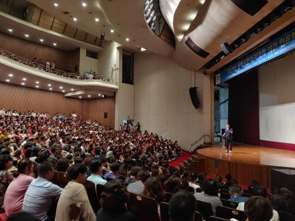 이날 특강에서는 ‘유쾌한 소통의 법칙’이라는 주제로 현대인들에게 필요한 소통능력을 키우는 방법에 대해 김창옥 대표 특유의 유머와 진정성 있는 화법으로 강연이 펼쳐졌으며, 선착순 무료입장으로 진행된 강연은 전석 매진을 기록했다.