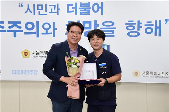 서울시의회 강동길 의원은 지난 16일 서울시의회 더불어민주당 대표실에서 민주노총 공공운수노동조합 서울지역공무직지부로부터 감사패를 수여받았다.