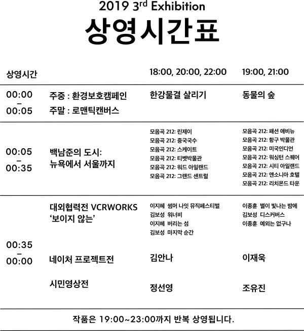 전시시간은 매일 저녁 6시부터 밤 11시까지 5시간 반복전시하며, 각 작품의 전시시간표에 따라 순차적으로 상영된다.