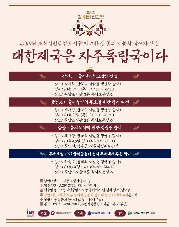 포천시 중앙도서관은 오는 10월 10일부터 진행되는 2019년 도서관 ‘길 위의 인문학’ 3차 참여자를 모집한다고 밝혔다.