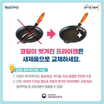 식품의약품안전처는 프라이팬 바닥 코팅이 벗겨져 본체가 보인다면 새 제품으로 교체하는 것이 바람직하다고 밝혔다.