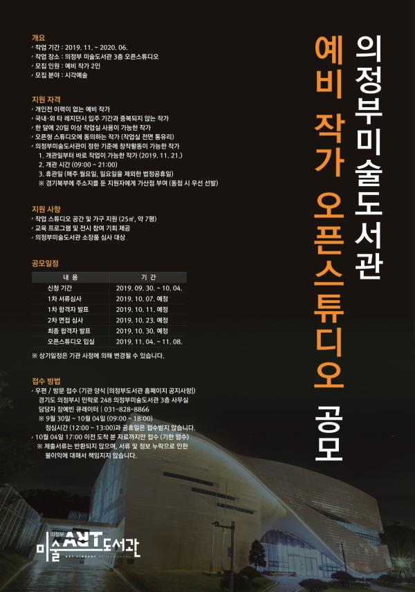 미술과 책이 융합된 새로운 패러다임의 전문 공공도서관인 의정부미술도서관은 오는 11월 21일 개관을 앞두고 미술 분야 역할의 공공성을 강화하기 위하여 예비 작가 지원을 위한 오픈스튜디오를 운영한다.