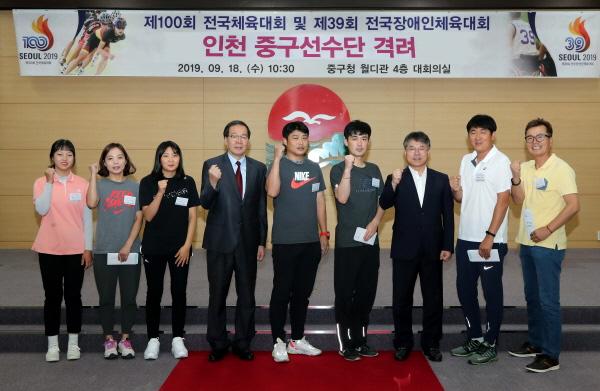 인천광역시 중구체육회는 지난 18일 중구청 월디관 대회의실에서 ‘제100회 전국체육대회’ 및 ‘제39회 전국장애인체육대회’에 참가하는 중구 관내 선수단을 격려했다.